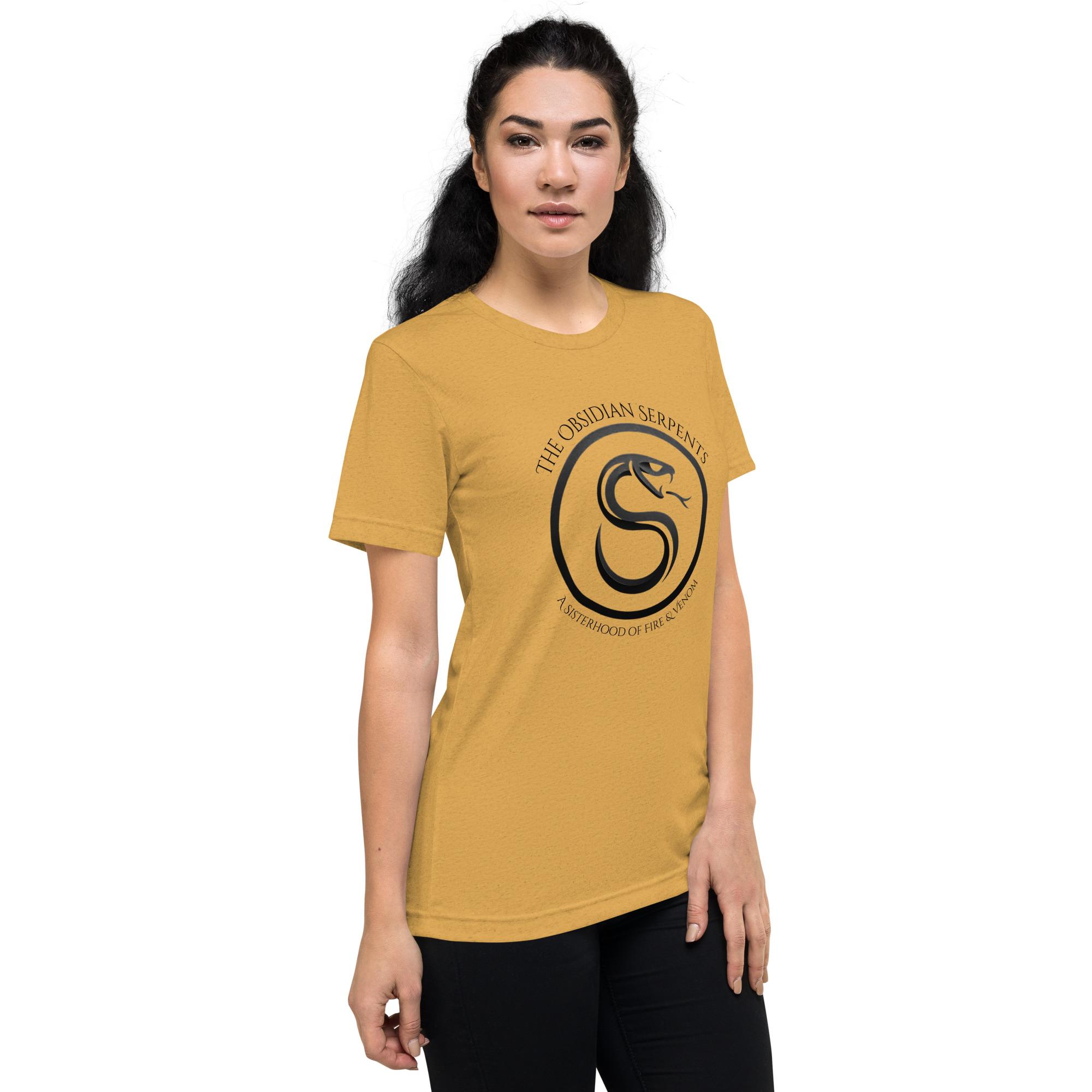 The Obsidian Serpent branded shirt, in gold. Pair with black pants/shorts/skirt for maximum brand alignment.